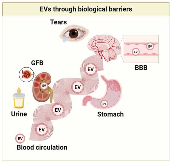 Summary of the different biologic barriers penetrated by EVs. GFB: glomerular filtration barrier; BBB: blood–brain barrier. Created in Biorender.com, accessed on 6 December 2022.