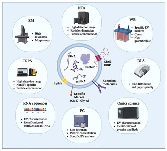Summary of the different methods for characterization and quantification of EVs. The characterization and quantification of EVs are performed through different techniques such as nanoparticle tracking analysis (NTA), flow cytometry (FC), Western blot (WB), transmission electron microscopy (TEM), and scanning electron microscopy (SEM). TEM analyzes EV diameters and morphology. Dynamic light scattering (DLS) determines EV size distribution and polydispersity by detecting the diffusion coefficient of the scattering EVs. NTA detects EV dimensions and concentrations through scattered light measurement and Brownian motion. RNA sequences and mass spectrometry permit cargo characterization. In particular, FC can be employed for size detection, particle concentration, and EV-specific markers. Tunable resistive pulse sensing (TRPS) only measures particle concentration. Created in Biorender.com, accessed on 6 December 2022.