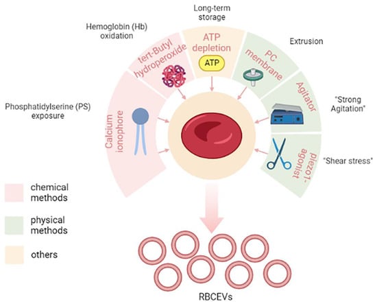 Methods for increasing the yield of RBCEVs production. In the figure, different chemical and physical methods are shown. In particular, molecules and/or mechanical stimuli are depicted together with their effect on the cells that give rise to RBCEVs release. Long-term storage is a particular condition that cannot be included in either the chemical or physical methods. Created in Biorender.com, accessed on 5 December 2022.