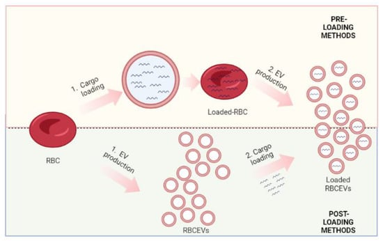 Methods for cargo loading in RBCEVs. Loading methods have been divided into two main classes, namely pre-loading and post-loading methods. In the first, the cargo is loaded into the donor cell before the vesiculation process. While, in the second method, the cargo is loaded into the already produced vesicles. Created in Biorender.com, accessed on 9 January 2023.