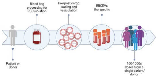 RBCEVs platform for clinical exploitation. The figure represents the road for the clinical exploitation of RBC-derived EVs, which could be achieved in the near future, and shows some of the advantages of this promising strategy. Created in Biorender.com, accessed on 14 December 2022.