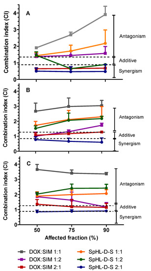 For the different molar ratios of DOX:SIM, free or encapsulated, the percentage of viable cells was subjected to effect analysis and the combination index (CI) values were determined using CalcuSyn® (Biosoft, Ferguson, MO, USA). CalcuSyn® software allows for the simulation of synergism and antagonism at all dose and effect levels using the median effect algorithm. The values adopted to determine the effects were: synergistic effect, CI < 0.9; additive effect, CI between 0.9 and 1.45; and antagonistic effect, CI > 1.45 [19].