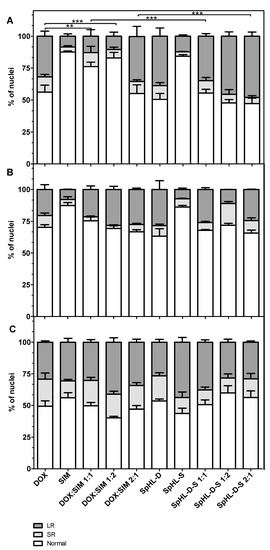 After DOX treatment, either in the free form or SpHL-D, MDA-MB-231 data analysis showed N nuclei ranging from 55 to 65%, SR equal to 10%, and LR varying from 25 to 35%. The values obtained after SIM treatment in both forms were 85%, 3%, and 12% for N, SR, and LR, respectively. These findings are in agreement with viability cell studies and reinforce the lower cytotoxic activity of SIM for this cell line. A significant reduction in LR nuclei was also verified, followed by increased N nuclei, after treatment with free DOX:SIM 1:1 or 1:2 compared to free DOX. In contrast, a significant increase in LR nuclei was detected after SpHL-D-S 1:2 and SpHL-D-S 2:1 treatments. It was also observed that the encapsulation of DOX:SIM 1:1 and 1:2 resulted in a significant increase (p < 0.001) in LR nuclei compared to free-form DOX at the same ratio. The increase in the levels of LR nuclei demonstrated an increase in senescence induction.