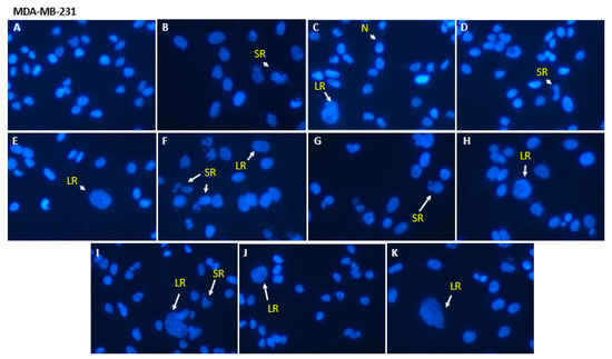 Figure 3 shows fluorescence photomicrographs of MDA-MB-231 nuclei stained with Hoescht 33342. An enlargement for cells exposed to the different treatments is evident compared to untreated cells. These characteristics correspond with the typical phenotypic morphology of senescence. It is also possible to observe the different distributions of LR and SR nuclei in relation to the control N that did not receive drug treatment. SK-BR-3 and MCF-7 cells had similar profiles to MDA-MB-231; thus, those images were not presented and are available in the Supplementary Materials (Figure S1).