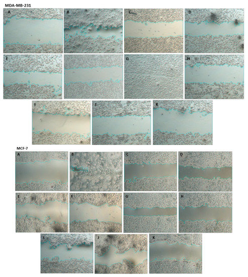 Cell migration was evaluated by a wound-healing assay that allowed the observation of two-dimensional cell migration in confluent monolayer cell cultures. SK-BR-3 human breast cancer is non-metastatic; in attempted invasive assays, this cell line did not show invasiveness, so it was not used at this stage of the study [25,26].