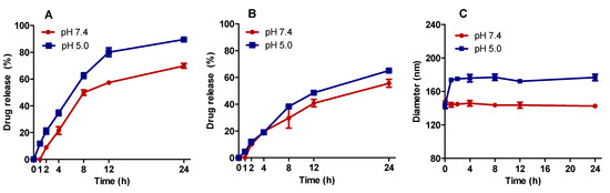 It is well-known that the antitumor efficacy of pH-sensitive liposomes depends on their ability to release the drug into the tumor region. In an acidic environment, these formulations, composed of DOPE (a fusogenic lipid), can fuse or destabilize, releasing the encapsulated content [36,37]. Herein, the release study was carried out at pH 5.0 and 7.4. The release profile showed that the released total percentage of both drugs was higher at pH 5.0 than 7.4 (Figure 5). In addition, there was a significant change in the diameter of vesicles at pH 5.0. These data suggest the pH sensitivity property of the system, even with the addition of SIM to the lipid bilayer. Furthermore, assuming that the pH in the non-tumor environment were 7.4, most of the drugs would remain circulating retained into the liposomes for a longer time and, thus, could lead to less toxicity in normal tissues [22,38].