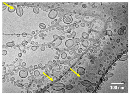 Morphological analysis of SpHL-D-S at a molar ratio of 2:1 was also performed by cryo-TEM (Figure 6). Images showed the presence of vesicles which were spherical and non-spherical, unilamellar, and reasonably uniform in diameter. The non-spherical form can be attributed to the presence of DOX crystals that force a change in the shape of the vesicles from spherical to non-spherical [27].