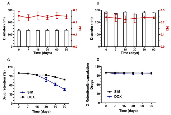 The physicochemical stability of SpHL-D-S 2:1 was studied over 90 days. No notable changes were observed in vesicle size and PDI (Figure 7A) for at least 90 days at 4 °C. Regarding the DOX and SIM retention into liposomes, both drugs were stable during the first 15 days. However, from the 15th day onwards, a gradual and significant reduction in the SIM-encapsulated level was observed, reaching about 50% in 90 days. The DOX concentration was maintained over time.