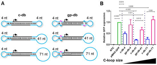 Increasing the size of conjugation loops (C-loop) does not impair the activity of dumbbell vectors generated using gap-primer PCR (gpPCR). (A) Design of conventional dumbbells (c-db) generated using the ELAN method only and of advanced dumbbells (gp-db) generated using gpPCR, each with various C-loop sizes. Black, double-stranded dumbbell core harboring the gene of interest; cyan, loops with indicated loop size; magenta, mismatch-triggering a basic position. (B) HepG2 cells were transfected with different dumbbell vectors harboring different C-loop sizes or the pMAX-GFP vector and MaxGFP expression was monitored 48 h post-transfection using flow cytometry. Mean ± SEM (n = 3). Significance was tested using the unpaired student’s t-test.