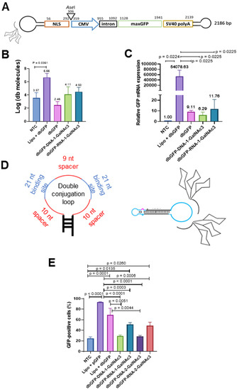 Uptake and expression of MaxGFP dumbbell-GalNAc3 conjugates by HepG2 cells from culture medium. (A) Design of the MaxGFP dumbbell-GalNAc conjugates. (B) HepG2 cells well exposed to DNA-linker- (dbGFP-DNA-1-GalNAc3), RNA-linker- (dbGFP-RNA-1-GalNAc3) or non-conjugated (dbGFP) MaxGFP dumbbells or transfected with dbGFP. Intracellular dumbbell DNA was isolated after 24 h and quantified using qPCR. (C) HepG2 cells well exposed to DNA-linker- (dbGFP-DNA-1-GalNAc3), RNA-linker- (dbGFP-RNA-1-GalNAc3) or non-conjugated (dbGFP) MaxGFP dumbbells or transfected with dbGFP. RNA was isolated after 24 h and quantified using RT-qPCR. (D) Design of the double conjugation loop comprising two 21 nt conjugation oligonucleotide binding sites (blue) flanked each by a 10 nt spacer (red) and separated by a 9 nt spacer (red), left panel; schematic of a dumbbell conjugate with two GalNAc3 residues attached to a single conjugation loop. (E) Average numbers of GFP = positive cells quantified using flow cytometry analyses of HepG2 cells exposed for 48 h to dbGFP-GalNAc3 conjugates added to the cell culture medium. NTC: No-transfection control; Lipo + pGFP: Cells transfected with pMaxGFP plasmid and Lipofectamine 3000; Lipo + dbGFP: Cells transfected with MaxGFP expressing dumbbell and Lipofectamine 3000; dbGFP-DNA-1-GalNAc3: MaxGFP expressing dumbbell conjugated with 1 GalNAc3 residue via a DNA linker; dbGFP-RNA-1-GalNAc3: MaxGFP expressing dumbbell conjugated with 1 GalNAc3 residue via a RNA linker: dbGFP-DNA-2-GalNAc3: MaxGFP expressing dumbbell conjugated with 2 GalNAc3 residues via a DNA linker: dbGFP-RNA-2-GalNAc3: MaxGFP expressing dumbbell conjugated with 2 GalNAc3 residues via a RNA linker. Mean ± SEM (n = 5). Significance was tested using the unpaired student’s t-test.