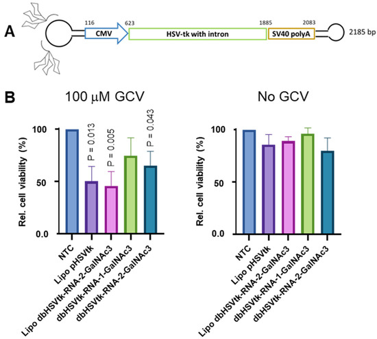 As our intention is to develop dumbbell-GalNAc3 conjugates for suicide gene therapy of hepatocellular carcinoma (HCC), we attached two GalNAc3 residues via RNA linker oligonucleotides to a HSVtk expressing dumbbell vector (Figure 4A). To test the cell death activity of the conjugates, the vectors were added to the culture medium of HepG2 cells. The HSVtk dumbbell-2-GalNAc3 double-conjugate but not the HSVtk dumbbell-1-GalNAc3 conjugate featured with only one GalNAc3 residue, triggered significant death of HepG2 cells, i.e., a 34.7% reduction of cell viability at day six in an alamarBlue cell viability assay, upon 100 µM GCV treatment (Figure 4B). For comparison, lipofection of HepG2 cells with an HSVtk expressing plasmid or double-conjugated dumbbell vector reduced the cell viability by 49.8% or 54.2%. These data also indicate that dumbbell conjugation with 2 GalNAc3 residues via an RNA linker did not impair gene expression as compared with the unconjugated dumbbell. Notably, no significant reduction of cell viability was observed in the absence of GCV treatment.