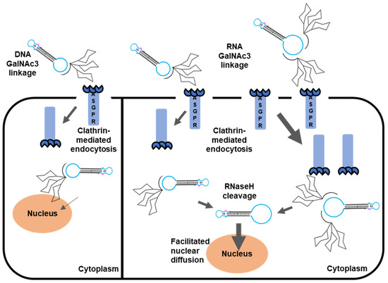 Schematic depicting the concept of GalNAc3-mediated cellular uptake and expression of dumbbell vector DNA. Single GalNAc3 conjugates bind towards one asialoglycoprotein receptor (ASGPR) and are internalized by the cell via clathrin-mediated endocytosis. Double GalNAc3 conjugates can bind to two ASGPR receptors which facilitate cellular uptake. RNA-linker- but not DNA-linker-conjugates are cleaved by the endogenous RNaseH resulting in release of the GalNAc3 residues from the dumbbell DNA. Unconjugated dumbbells are less bulky, and exhibit facilitated diffusion through the nuclear pore complex resulting in higher levels of transgene expression.