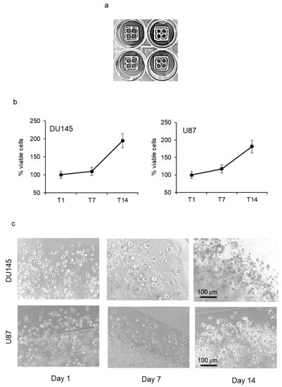 Tumor cell growth in bioprinted scaffold. (a) Exemplificative image of bioprinted algine/gelatin constructs printed in 12-well multiwell plate. (b) Mean percentage of viable DU145 and U87 cells grown in bioprinted scaffold and evaluated 1, 7, and 14 days (T1, T7, T14) after bioprinting. The mean values measured at T1 were adjusted at 100%. Each value represents the mean of five different bioprints (±standard deviation). (c) Representative images acquired by phase contrast microscopy (100× magnification) of bioprints containing DU145 (upper images) and U87 cells at days 1, 7, and 14 after printing.