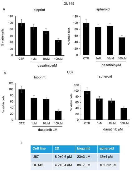 Antiproliferative effect of dasatinib in 3D cell models. Bioprinted tumor cells and tumor spheroids, utilizing both DU145 and U87 cells, were subjected to increasing concentrations of dasatinib (1 μM, 10 μM, and 100 μM) for 72 h and tumor growth was monitored by PrestoBlue® cell viability reagent. Dasatinib determined a significant reduction in cell viability that was evident starting from 1 μM with similar trends in the two different cell models (Figure 2a,b). Dasatinib cytotoxicity was more marked in U87 cells compared to DU145 cells. In addition, according to IC50 value, bioprinted cells demonstrated a higher sensitivity to dasatinib compared to spheroids, but both spheroids and bioprints were far less susceptible to dasatinib action compared to 2D cell culture treated in the same experimental conditions (Figure 2c).