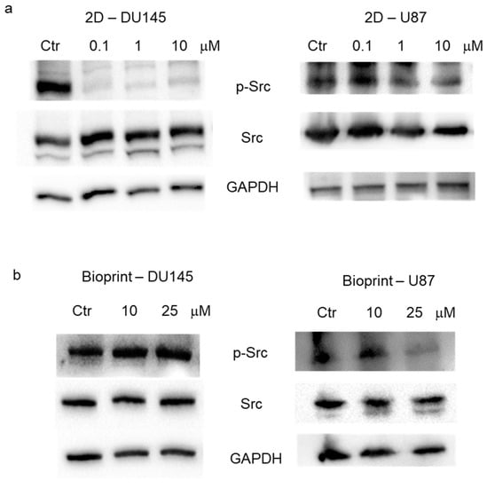 Evaluation of Src activation. (a) Western blot analysis of total cell lysates from DU145 (left) and U87 (right) cells cultured in standard conditions (2D). Cell lysates were recovered 24 h after dasatinib treatment with increasing concentrations (0.1, 1, and 10 μM) and analyzed for the expression of pSrc (Tyr416), total Src, and GAPDH (loading reference). (b) Western blot analysis of total cell lysates from DU145 (left) and U87 (right) cells cultured alginate/gelatin bioprinted scaffold (bioprint). Bioprints were treated for 24 h with 10 or 25 μM dasatinib and analyzed for the expression of pSrc (Tyr416), total Src, and GAPDH (loading reference).