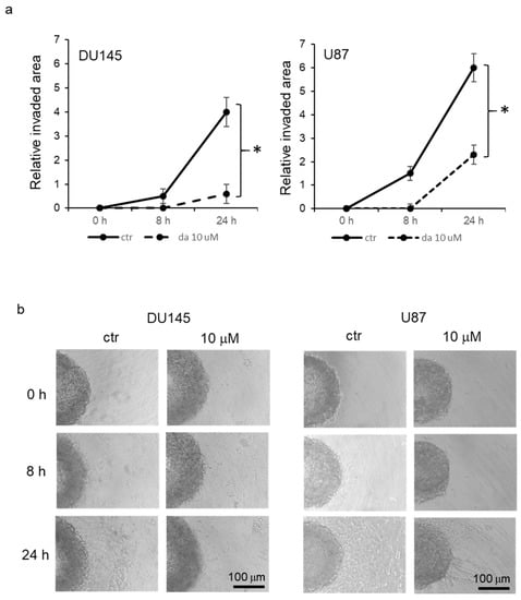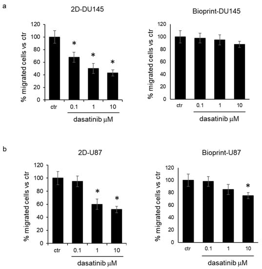 Inhibition of cell migration by dasatinib. (a) Percentage of migrated DU145 cells evaluated in transwell system utilizing cells from standard cell culture (2D, left) or from bioprint model (right) and treated for 24 h with increasing concentrations of dasatinib (0.1, 1, and 10 μM). The mean values measured in untreated cells were adjusted at 100%. Each value represents the mean of five different measurements (±standard deviation). * p < 0.01 vs. ctr, according to Student’s t test. (b) Percentage of migrated U87 cells evaluated in transwell system utilizing cells from standard cell culture (2D, left) or from bioprint model (right) and treated for 24 h with increasing concentrations of dasatinib (0.1, 1, and 10 μM). The mean values measured in untreated cells were adjusted at 100%. Each value represents the mean of five different measurements (±standard deviation). * p < 0.01 vs. ctr, according to Student’s t test.