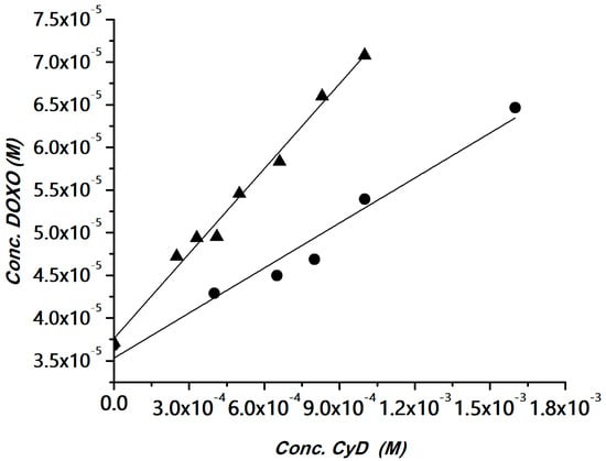 A linear correlation between DOXO solubility and CyD concentration was obtained, with a slope <1 (AL type graph). The diagrams were fitted with the following equation, where CyD is the concentration of the cavities: