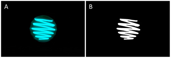 (A): Macroscopic image of an agar plate in the dark cultured with A. fischeri swabs after 18 h. (B): Macroscopic image after the automated threshold algorithm (Supplementary Materials, Table S2) that subtracted the background of the image. The remaining white pixels correspond to the bioluminescence intensity of A. fischeri.