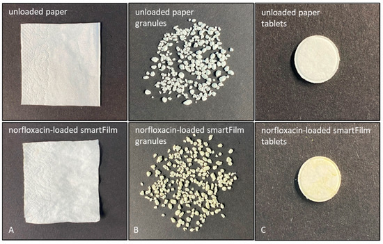 Macroscopic images of (A): unloaded paper (upper) and paper loaded with norfloxacin (smartFilms, lower), (B): unloaded paper granules (upper) and norfloxacin-loaded smartFilm granules (lower) (C): unloaded paper tablets (upper) and norfloxacin-loaded smartFilm tablets (lower).