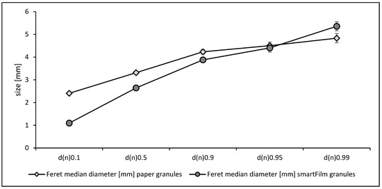 The Feret diameter of the unladed paper granules was 3.3 ± 0.9 mm and was 2.6 ± 1.0 mm for the norfloxacin-loaded smartFilm granules. The numeric size distribution showed that the d(n) 0.1, d(n) 0.5 and d(n) 0.9 values were significantly lower for the smartFilm granules. The d(n) 0.95 values were similar but the d(n) 0.99 value was higher for the smartFilm granules (Figure 3). This means the norfloxacin granules possessed a slightly smaller mean particle size and a slightly broader size distribution than the unloaded paper granules. The smaller size of the smartFilm granules can be explained by an increased density of the cellulose matrix that is caused by loading the drug into the pores of the paper [10]. The trend towards some larger particles can also be explained by the increased density of the drug-loaded smartFilm granules, i.e., due to the reduced pore size, the uptake of the binding agent into the pores is reduced, which then reduces the granulation efficiency of the binder.