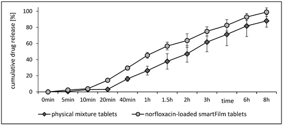 Cumulative drug release of norfloxacin from norfloxacin-loaded smartFilm tablets in comparison to physical mixture tablets.