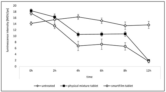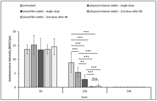 In the next step, we aimed to investigate the differences between the two formulations in more detail, i.e., at different time points within the predetermined time frame of the ex vivo model. For this, the formulations were applied on the intestines, and samples were taken at 2 h, 4 h, 6 h, 8 h and 12 h after application. After 8 h, a second dose, i.e., a booster dose, was applied and final samples were taken after 12 h. Untreated tissues served as controls (Figure 8). At the beginning, slightly fewer active bacteria were located on the non-treated intestinal sections. After 2 h, the differences were cancelled out between untreated controls and the physical mixture tablets, i.e., all sections had a similar luminescence intensity. The tissue sections treated with the smartFilm tablets resulted in a lower luminescence intensity (Mann–Whitney test, p < 0.05). The results therefore indicate that the smartFilm tablets acted faster than the physical mixture tablets. After 4 h, all treated intestine sections showed a lower luminescence intensity than the untreated intestine sections and the effect was significant for both formulations. The smartFilm tablets resulted in significantly less luminescence intensity than the physical mixture tablets. After 6 h and 8 h, the differences between the formulations became smaller, but remained significant. For both formulations, after 4 h, a plateau in antibacterial activity was reached. Hence, in between 4 h and 8 h no further decrease in the antibacterial activity was observed. After 12 h, and after application of the second dose, the activity of the bacteria declined to almost zero, with no significant differences between the smartFilm tablets and the physical mixture tablets (Figure 8).