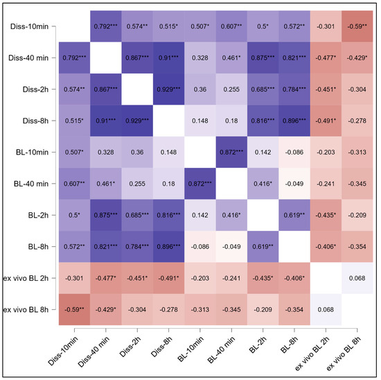 Heatmap of Pearson correlation coefficients (selected time points) that assess the relationship between the in vitro dissolution data (Diss), the in vitro bioluminescence inhibition (BL) and the ex vivo antibacterial activity (ex vivo BL) data for the physical mixture and the norfloxacin-loaded smartFilm tablets at different time points. * p < 0.05, ** p < 0.01, *** p < 0.001.