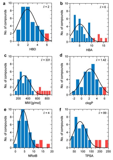 Distribution of the (a) hydrogen bond donors (HBD), (b) hydrogen bond acceptors (HBA), (c) molecular weight (MW), (d) calculated partition coefficient (clogP), (e) rotatable bonds (NRotB), and (f) topological polar surface area (TPSA) for the investigated dataset. Values that adhere to the Lipinski rule of five and Veber’s rule are colored in blue. The inset number represents the median of the dataset for each molecular descriptor.