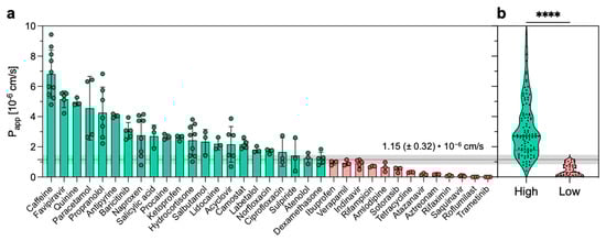 Apparent permeability (Papp) of the dataset. (a) The dataset is classified using a binary classification (high/low) according to the Papp. The threshold was set at 1.15 (±0.32) × 10−6 cm/s. (b) Student’s t-test was used to test the statistical significance between the high- and low-permeable groups (**** p < 0.0001).