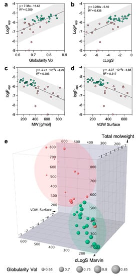 Two-dimensional plots of the logarithm of apparent permeability (Papp) versus (a) globularity (globularity Vol), (b) intrinsic solubility (cLogS), (c) molecular weight (MW), and (d) the Van der Waals Surface (VDW Surface). The gray area represents the prediction bands using a 90% confidence level. (e) Three-dimensional plot depicting the chemical space of the dataset as defined by cLogS, MW, and VDW Surface. The marker is sized by globularity volume. A binary color code is used to distinguish between high- (green) and low- (red) permeability compounds.