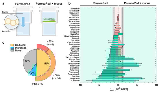 In the next step, we investigated the impact of a pathological mucus model on the permeation of the compounds tested. We used a cystic fibrosis mucus model that was adapted to the PermeaPad 96-well plate following the same approach used in our previous work [26]. The mucus was directly pipetted on top of the membrane of the donor compartment to mimic mucosal tissues (Figure 5a). The mucus model remained stable during the course of the experiment, with a minimum variation in weight and thickness (data not shown) according to what had previously been reported for the mucus model itself [25]. No visible alterations in the PermeaPad membrane were detected. The effect of mucus was evaluated by comparing the apparent permeability recorded with and without mucus (Figure S5); the effect was considered significant only when the p-value between the two systems was <0.05.