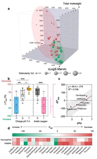 The effect of mucus and how it relates to the physicochemical properties of drugs. (a) Three-dimensional plot depicting the chemical space of the dataset as defined by cLogS, MW, and VDW Surface. The marker is sized by globularity volume. A binary color code is used to distinguish between high- (green) and low- (red) permeability compounds. (b) Box plot representation of charge at pH 7.4 and number of acidic oxygens versus the variation of permeability (ΔPapp) caused by mucus. Medians are represented as black horizontal lines, while the mean is represented as a plus symbol. (c) The xy plot of the relationship between pKa and the variation of permeability caused by mucus. The gray area represents the prediction bands using a 90% confidence level. (d) Comparison between the ΔPapp obtained on PermeaPad and PAMPA 96-well plates. PAMPA data are retrieved from [26] (* p < 0.05, *** p < 0.001, **** p < 0.0001).