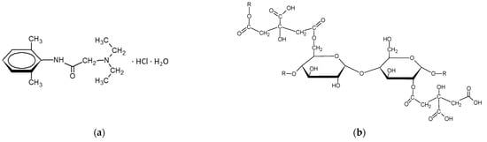 Lidocaine hydrochloride (LH) (Figure 1a) is a well-known anesthetic mainly used in dentistry, minor surgical procedures or to relieve pain during injections or disease conditions [1,2]. The external use of LH is widely available, and although allergic reactions to this drug are rare (1:1000) [3], it may cause discomfort, leading to discontinuation of the treatment. The introduction of drug derivatives such as articaine [4], or an attempt to administer LH in the form of a complex with a polymer [5], may be an alternative. The modern pharmaceutical science looks for innovative drug carriers in the field of newly synthesized or modified polymers [6,7]. One interesting group of polymers are the starch derivatives [8,9]. The native starch may be modified by several processes, including annealing [10], oxidation [11], cross-linking [12] and etherification [13]. The economically interesting and easily handled process is derivatization by esterification [14], developed, i.a., by Zięba [14,15] and Raszewski (Figure 1b).