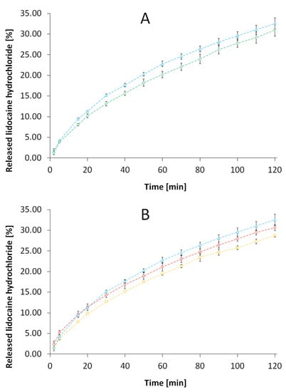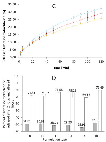 The high viscosity often favors the prolonged release of the active substance from the hydrophilic gel via increase of its intrinsic friction, which influences the diffusion constant. This pattern was well preserved for the period of 2 h when the LH was released, with exemption of F3 formulation, which had an extremely high viscosity of almost 12,000 mPas. For this formulation, the pH was also diminished compared to the other samples. It may be proposed that the high viscosity and low pH of F3 correlated with the level of citric acid and temperature of preparation process, however the resulting release was a compromise. The low pH (Figure 6B) could favor the solubility of lidocaine, whereas the high viscosity could result in increased intrinsic friction, so the effect on the release was balanced. The low pH of F3, comparable with the REF may be justified by comparison to the respective pH of additive S3. The preparation procedure of S3, as well as the level of citric acid could influence the recorded level of pH in F3.