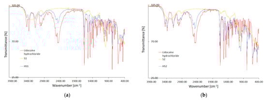 The spectra of pure LH, as well as the spectra of modified starches and formulations composed according to Table 4, are presented in Figure 3. On the graphs a–d, the plots of formulations HS1–HS4, were compared to respective modified starches S1–S4, and the FTIR spectrum of LH was attached in every case for detailed visualization.