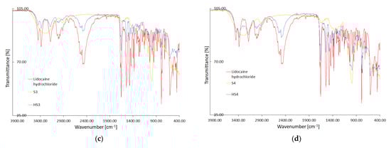 FTIR spectra of LH, modified starch (S1–S4) and experimental formulations of lidocaine hydrochloride with modified starch (HS1–HS4); (a–d) respectively. The abbreviations HS1–HS4 are elucidated in Table 4.