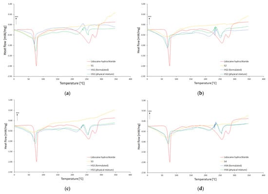 The samples of dried S1–S4, LH, their physical mixtures of 1:1 w/w, and dried formulations (HS1–HS4) were grated to a powder and studied using differential scanning calorimetry (DSC). The study was performed in differential scanning calorimeter (DSC 214 Polyma, Netzsch, Selb, Germany). Samples of 3–5 mg were scanned at a constant heating rate of 5 K/min in the temperature range from 0 to 350 °C, in aluminum containers under nitrogen flow of 50 mL/min.