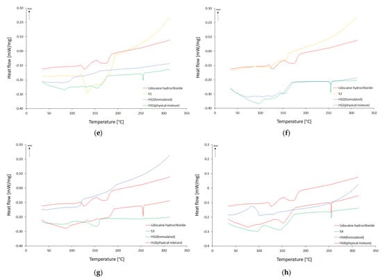 The DSC thermograms of lidocaine hydrochloride (LH); (a,c,e,g) thermograms of the first heating cycle; (b,d,f,h) thermograms of the second heating cycle, modified starch (S1–S4) and experimental formulations of LH with modified starch (HS1–HS4). The abbreviations HS1–HS4 are elucidated in Table 4.