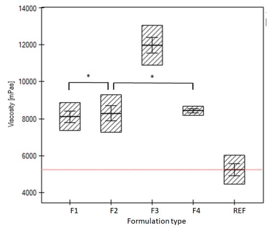 The viscosity of evaluated formulations F1–F4 and reference formulation REF (methylcellulose hydrogel). The red line refers to the mean viscosity of the REF. The abbreviations F0–F4 and REF are elucidated in the Table 2. An asterisk denotes the non-statistical significance of the formulation data according to the ANOVA statistical test for α = 0.05.