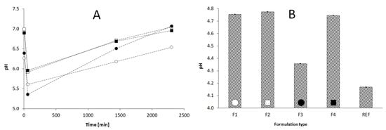 The pH of modified starch, S1: -○-; S2: -▫-; S3: -●-; S4: -▪- (A), applied in the respective evaluated formulations F1–F4 and reference formulation REF, and the pH of formulations F1–F4 and REF (B). The abbreviations S1–S4, as well as F1–F4 and REF are elucidated in the Table 1 and Table 2, respectively. The statistical significance of the formulation data observed according to the ANOVA statistical test for α = 0.05 (p < 0.05).