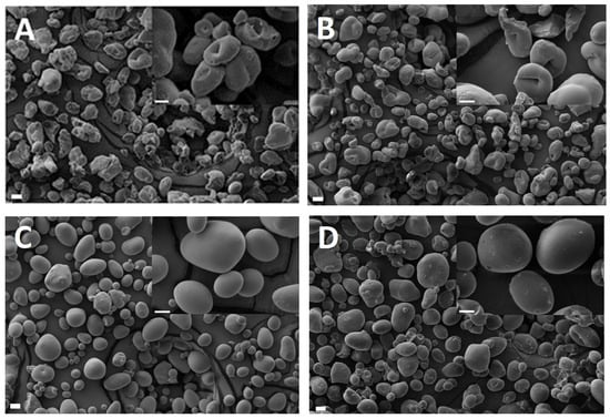 The morphology of applied starch particles is presented in Figure 7A–D, with inserts, which enable more detailed insight on the surface of the particles.