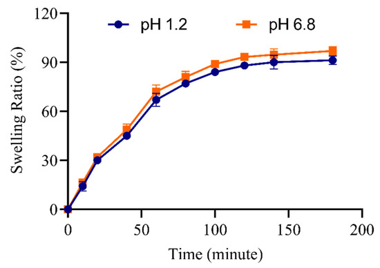 The dried polymeric nanobeads were weighed and stirred for 24 h at pH 1.2 and pH 6.8 at room temperature. Afterward, the resultant wet mass achieved a constant weight upon maximum swelling, and equilibrium swelling was measured using Equation (4).