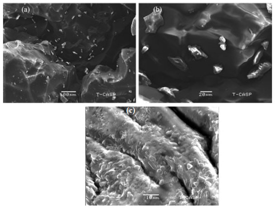 VRC HPβCD based polymeric nanobeads were very porous, compact, and spongy in appearance. Because of the porous nature, rough surface, and tiny size, water was absorbed instantly, resulting in immediate swelling and the release of VRC. Figure 4a,b depicts the irregular and rough surface having filled pores of a drug, while Figure 4c shows blank pores, indicating the absence of the drug. The prepared nanobeads had non-spherical shapes and varied sizes, resulting in a wide surface area, fast swelling, and improved solubility.