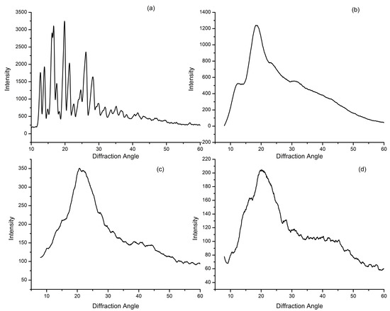 XRD diffractogram of VRC (a), HPβCD (b), Blank (c), and Loaded HPβCD based polymeric nanobeads (d).