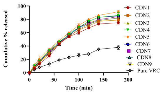 The maximum quantity of VRC was observed for CDN5, i.e., 87%. Product yield, whereas % EE results were in the range of 82–94% and 72–87%, as shown in Table 2. Polymer concentrations affect the % EE; % EE increases with increasing polymer concentration [26]. The formulation CDN5 showed maximum % EE due to the repulsion of sulfonic acid groups [27].