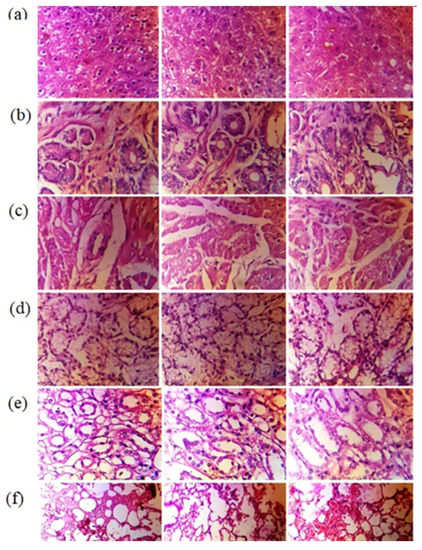 Histopathological examination of rabbit organs of Liver (a), stomach (b) heart (c), large intestine (d), kidney (e) and lungs (f).