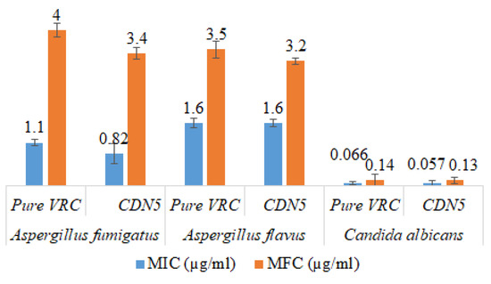 A significant increase in the antifungal activity of HPβCD based polymeric nanobeads was observed as compared to pure VRC. The MIC and MFC of CDN5 against Aspergillus fumigatus were 0.82 µg/mL and 3.4 µg/mL as compared to pure VRC having MIC and MFC were 1.1 µg/mL and 4 µg/mL, respectively. Similarly, In the case of Aspergillus flavus and Candida albicans, NIC and MFC were also significantly decreased as compared to pure VRC. The results are graphically presented in Figure 13.