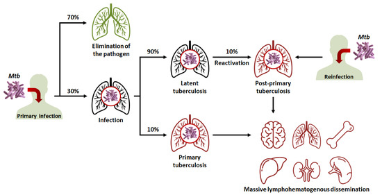 - In 10% of cases, most often in very young, elderly, or immunocompromised subjects, the granuloma will fail to contain Mtb. This phenomenon can also occur after the reactivation of dormant bacilli (which happens in 10% of latent cases) or with a novel inhalation of bacilli. The adaptive immune response will attempt to eliminate bacteria multiplying and escaping macrophages, but in doing so, will cause the destruction of lung tissue [1,26]. This will lead to the formation of caseous lesions and cavities, within which the growth of Mtb will no longer be controlled. TB will then evolve towards an active form. In certain cases, the pathogen will spread to other organs (brain, bones, liver, spleen, kidneys), and, in the most serious cases, the disease will evolve towards a miliary form, involving the massive lymphohematogenous dissemination of bacteria [27].