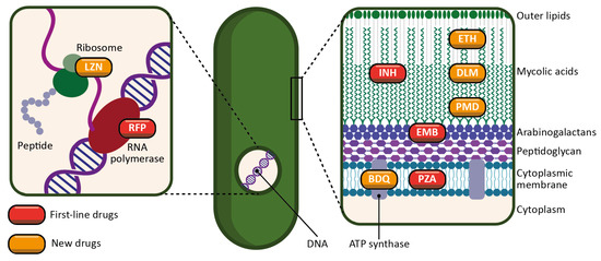 Schematic representation of the targets and mechanisms of action of the main antitubercular drugs. First-line drugs are represented in red (INH: isoniazid; RFP: rifampicin; PZA: pyrazinamide; EMB: ethambutol). New drugs, either newly discovered or repurposed, are represented in orange (ETH: ethionamide; LZN: linezolid; BDQ: bedaquiline; DLM: delamanid; PMD: pretomanid).