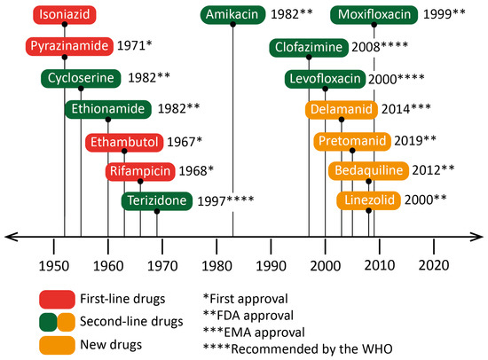 Dates of the first clinical trials for drugs recommended by the World Health Organization (WHO) for the treatment of tuberculosis (TB). The year of approval (or recommendation) for the use against Mycobacterium tuberculosis or against bacteria of the Mycobacterium genus is indicated next to the drug’s name. Isoniazid was accepted for prescription shortly after its first clinical trials. Some drugs, such as linezolid or moxifloxacin, were approved as broad-spectrum antibiotics, although specific clinical trials against TB occurred later. EMA: European Medicines Agency.